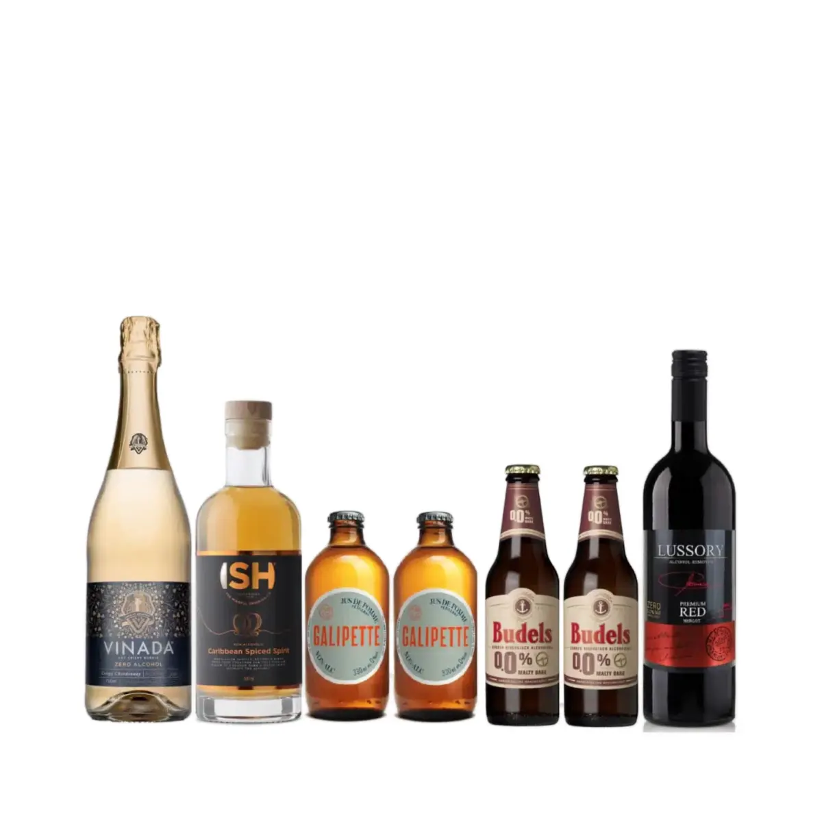 WINTER Non-alcoholic MULTI PACK – Premium Non-alcoholic Merlot + Non-alcoholic Caribbean Spiced Spirit ( non-alcoholic rum) + 2x Budels Non-alcoholic Dark beer + Vinada Non-alcoholic Sparkling Chardonnay + 2x Galipette Cider